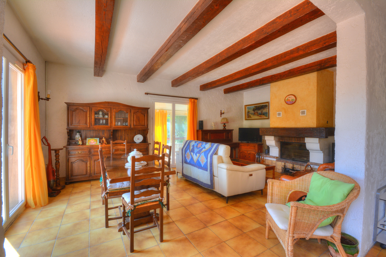 - Un salon séjour cosy avec cheminée et climatisation réversible ouvrant sur la terrasse ensoleillée et donnant sur une jolie véranda